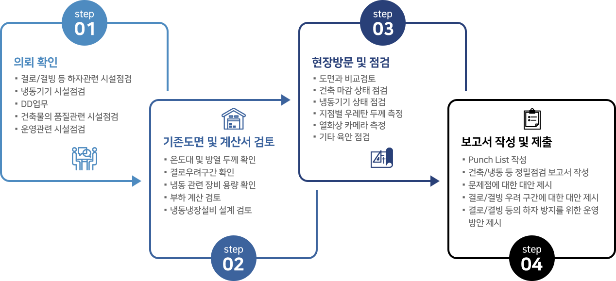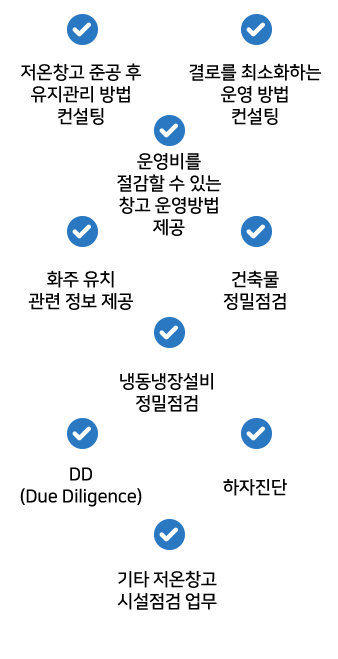 저온창고가 계획한 대로 제 기능을 원활히 수행할 수 있도록, 전문가들을 투입하여 시설점검 서비스를 제공합니다.